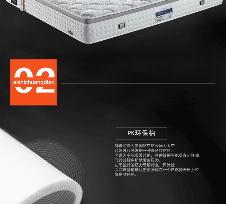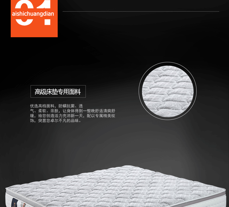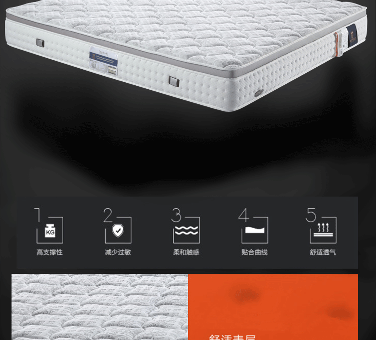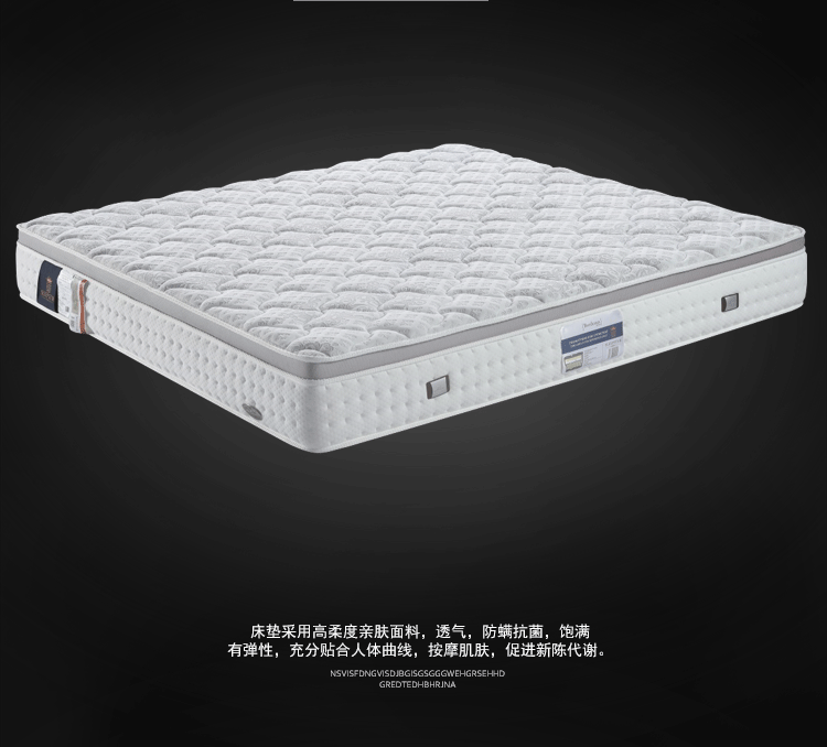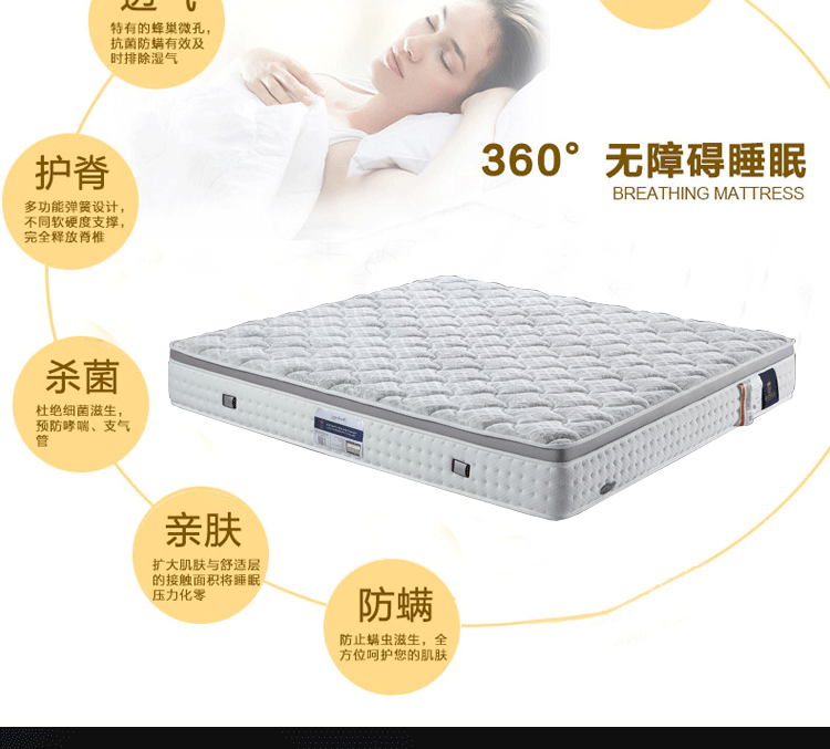 高级透气面料,抗菌防螨,排除潮气,全方位调节压力,在睡眠中促进血液循环,多功能弹簧可以完全释放脊椎,扩大肌肤与舒适层的接触面积,将睡眠压力化零