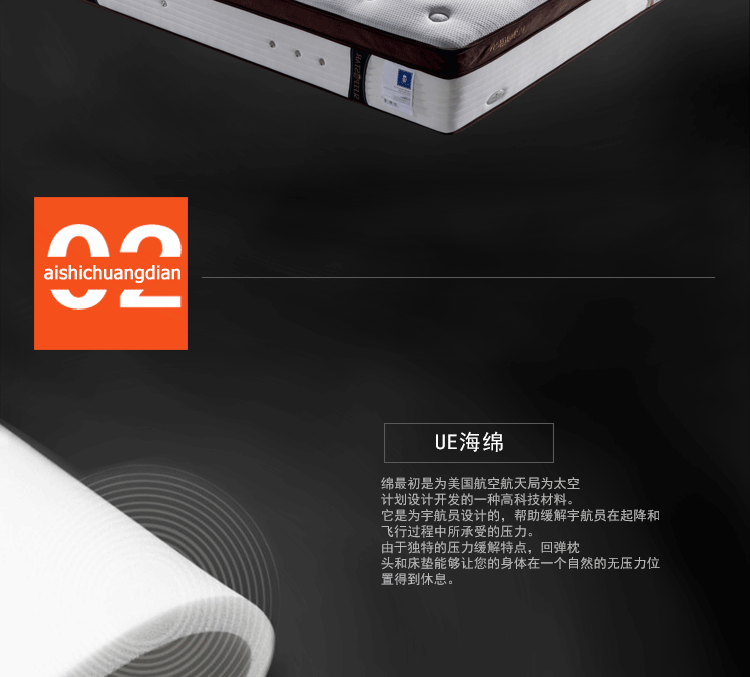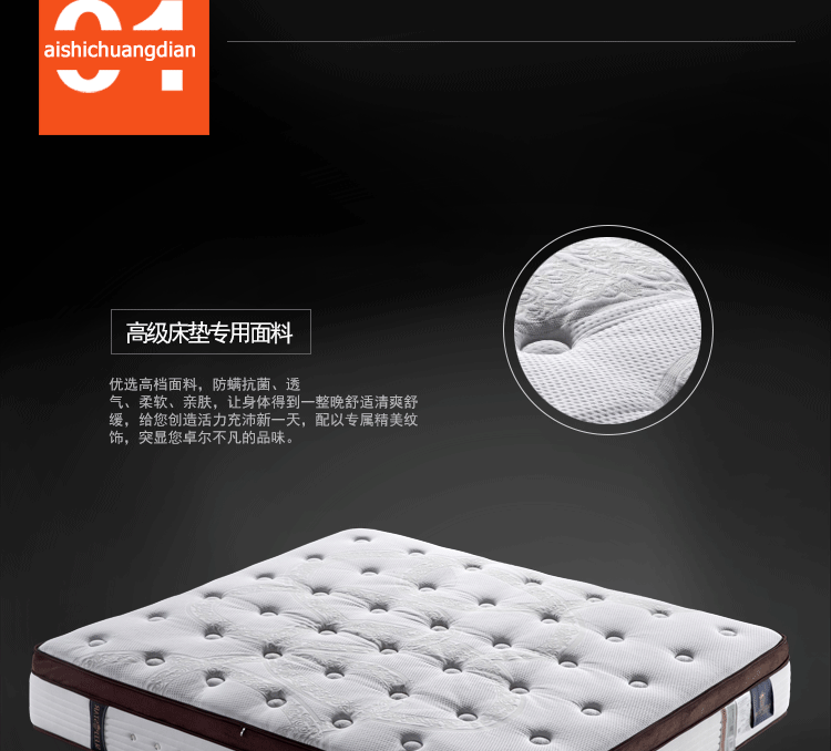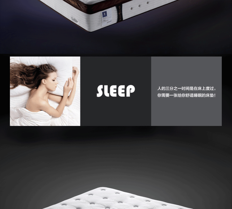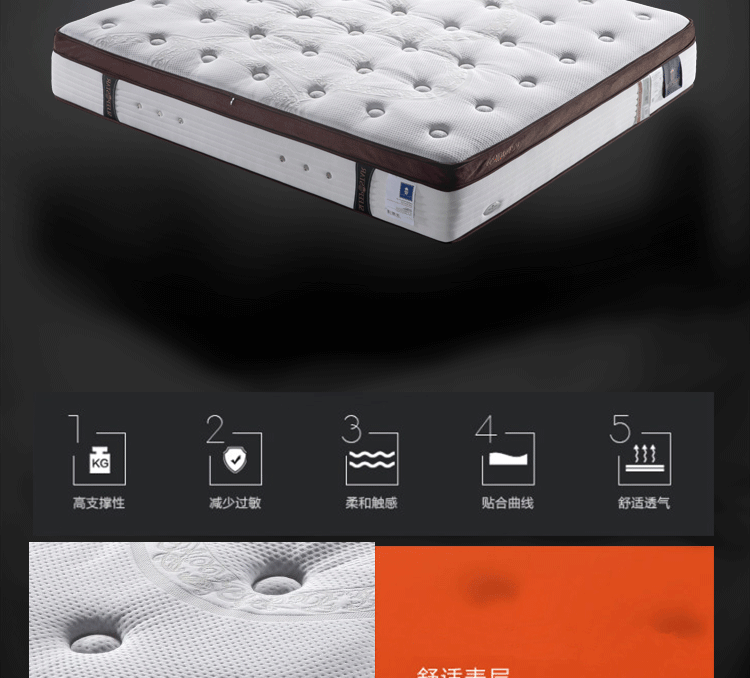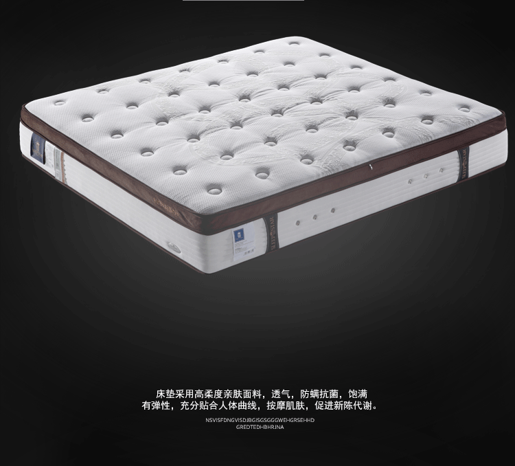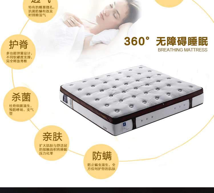 高级透气面料,抗菌防螨,排除潮气,全方位调节压力,在睡眠中促进血液循环,多功能弹簧可以完全释放脊椎,扩大肌肤与舒适层的接触面积,将睡眠压力化零
