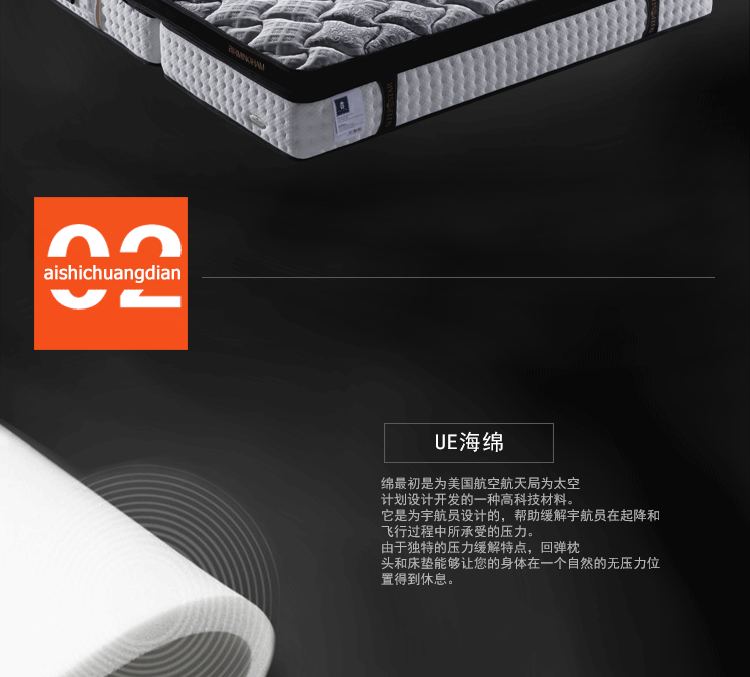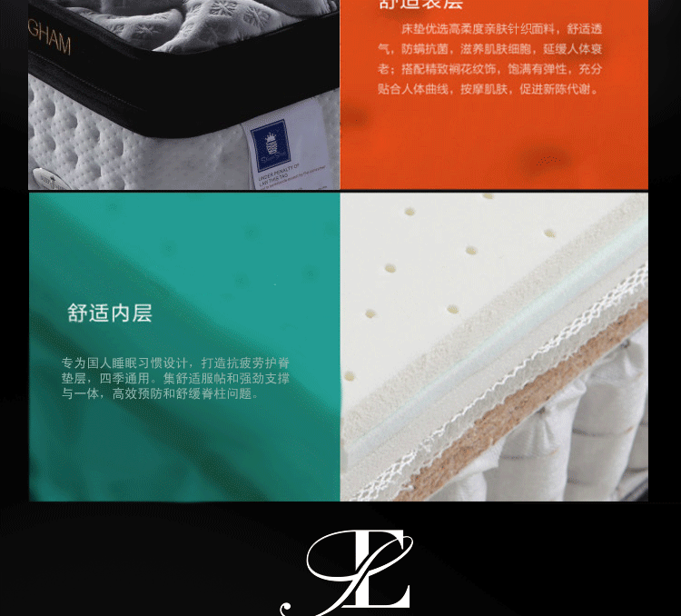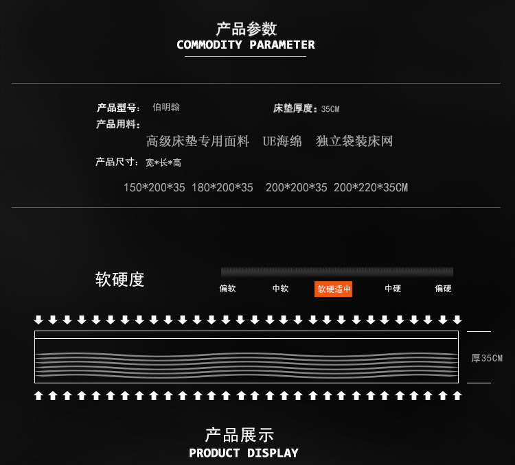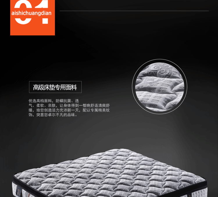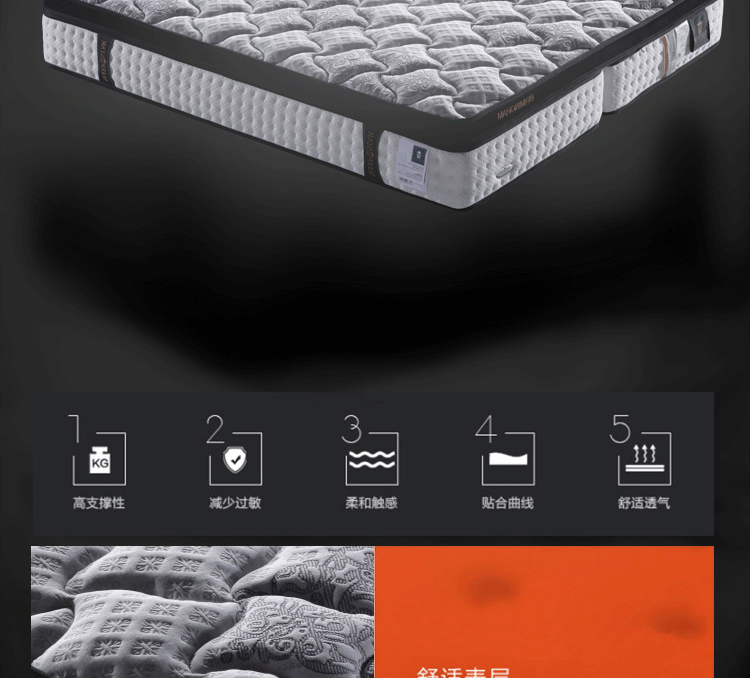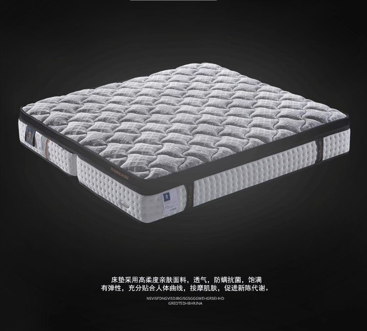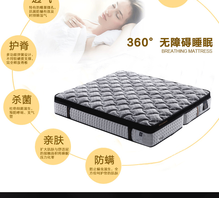 高级透气面料,抗菌防螨,排除潮气,全方位调节压力,在睡眠中促进血液循环,多功能弹簧可以完全释放脊椎,扩大肌肤与舒适层的接触面积,将睡眠压力化零