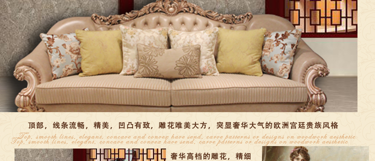 沙发看着很奢华,雕花蛮精致的,而且颜色搭配很漂亮,没什么味道,大气