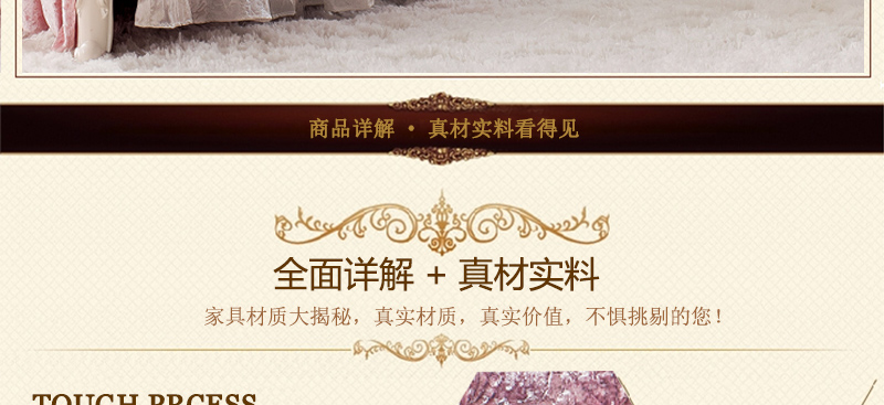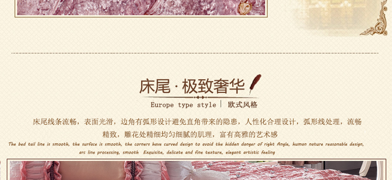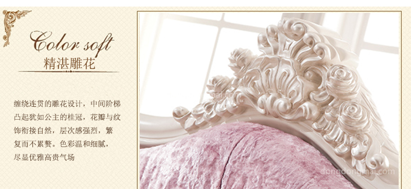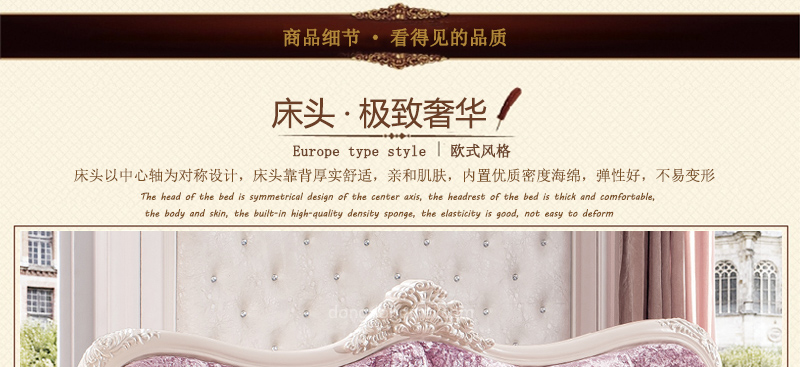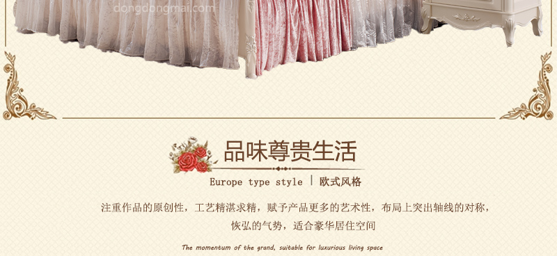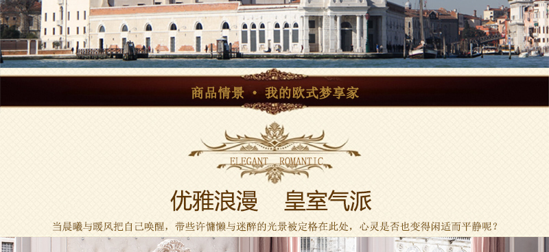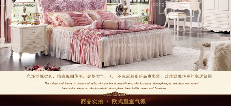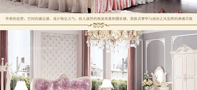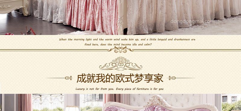 欧式风格家具特点讲究手工精细的裁切雕刻,轮廓和转折部分由对称而富有节奏感的曲线或曲面构成,结构简练,线条流畅,色彩富丽,艺术感强,给人的整体感觉是华贵优雅,十分庄重。