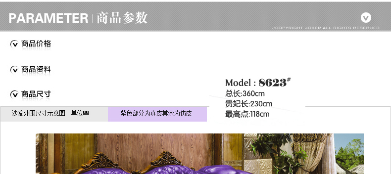 外围尺寸: 总长: 360cm 贵妃长:230cm 最高点:118cm