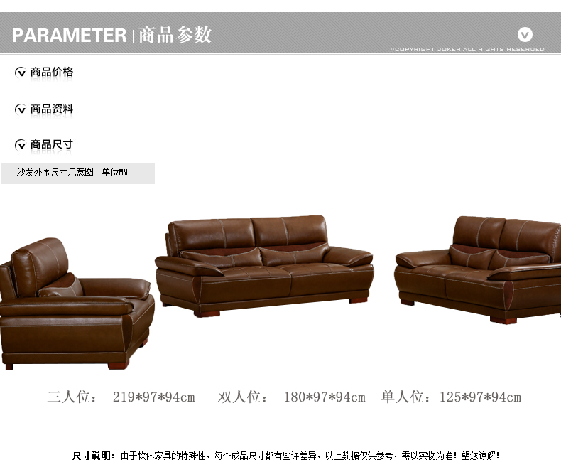 外围尺寸: 3人位: 219*97*94cm 2人位: 180*97*94cm 单人位:125*97*94cm