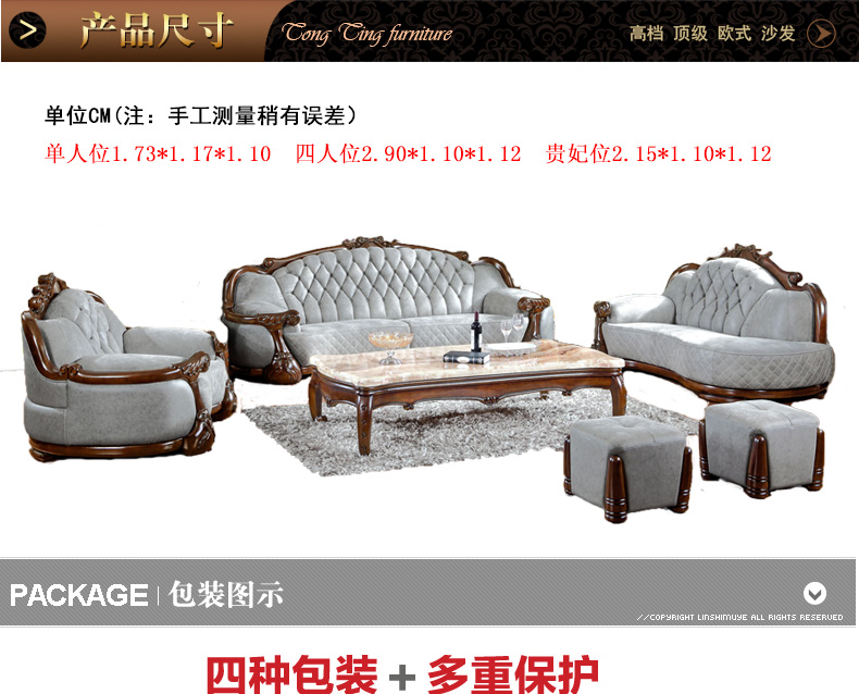 外围尺寸: 单人沙发 1.73*1.17*1.10 贵妃位 2.25*1.17*1.10 四位沙发 3.15*1.17*1.10 长几 (进口黑龙) 2.02*1.05 方几 (进口黑龙) 0.85*0.85