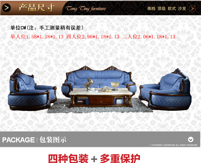 外围尺寸: 单位沙发 1.58*1.18*1.13 双人沙发 2.06*1.18*1.13 四人沙发 2.96*1.18*1.13 长几(进口黑龙) 1.8*1.0 方几 (进口黑龙) 0.85*0.85