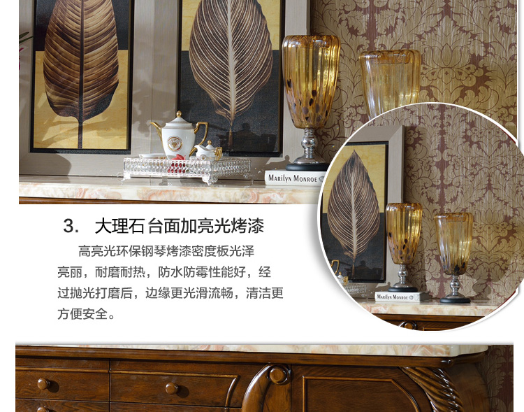 美式仿古做旧效果,手工雕花精致大方;精细设计的酒架,实木柜脚,多层隔断储物空间。清晰的拼花木面纹理,细腻而有光泽。每一处细致的雕花,传承百年美式经典工艺