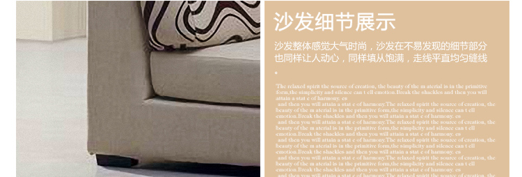 沙发整体质量很结实,款式大气时尚,颜色和图片一致,做工精细,沙发靠背很舒服