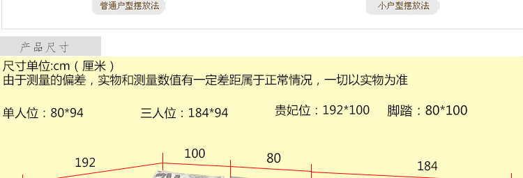 单人位:80*94 三人位:184*94 贵妃位192*100 脚踏:80*100(cm) 本款产品有两种颜色需要哪种颜色请联系客服!