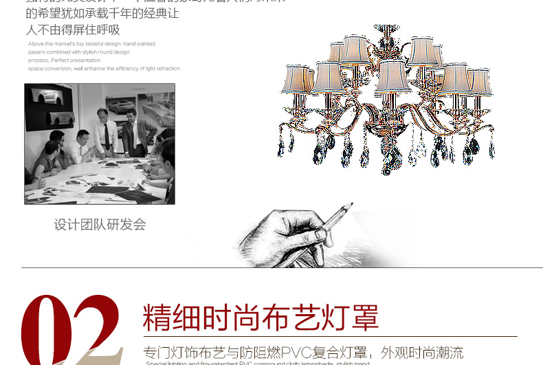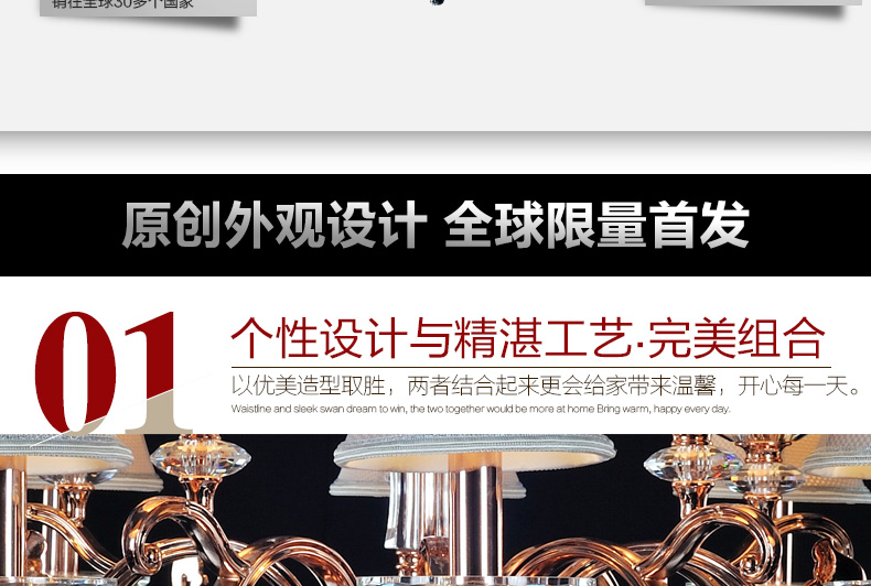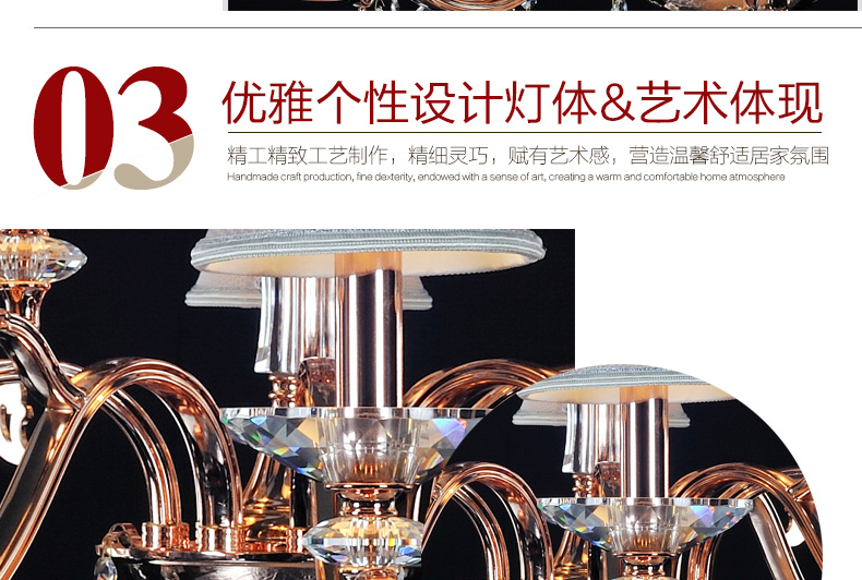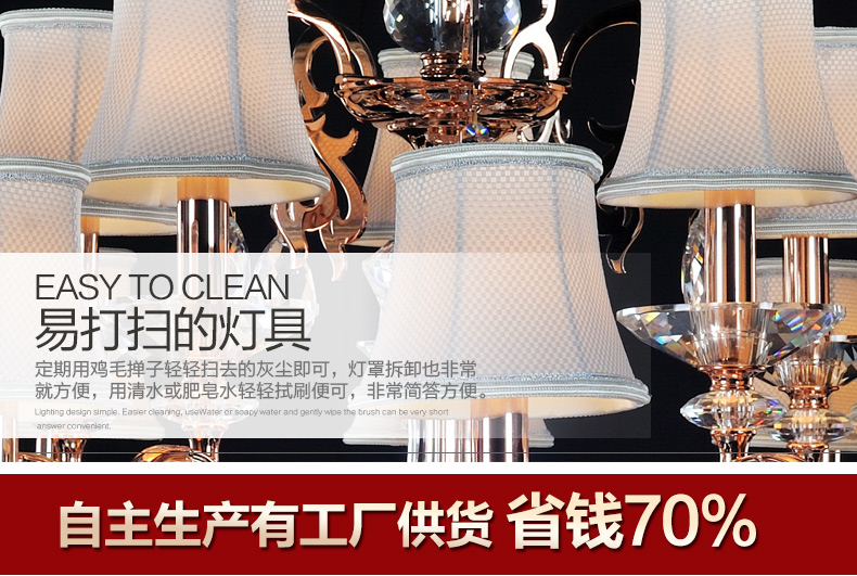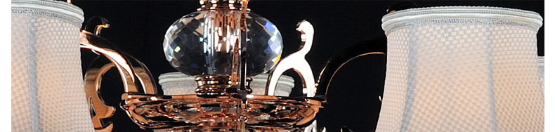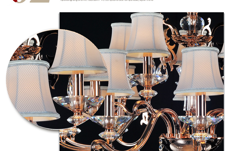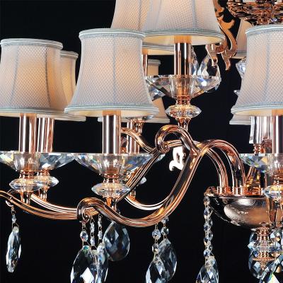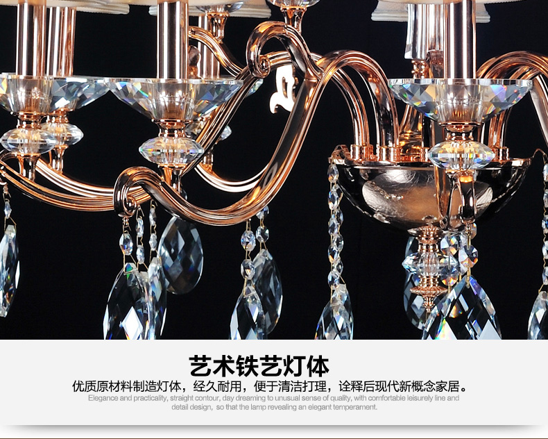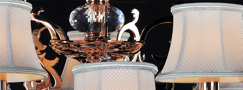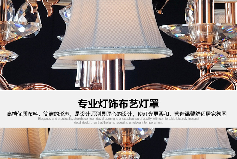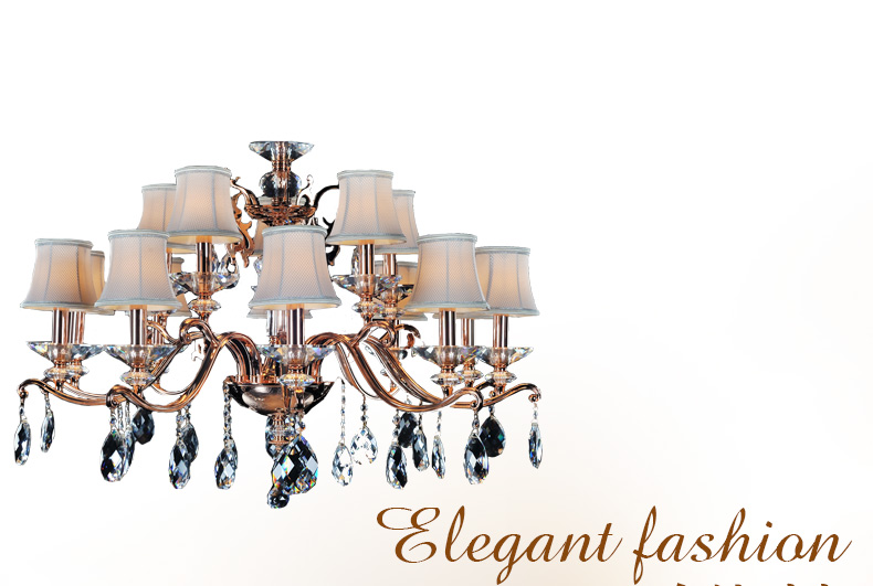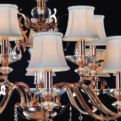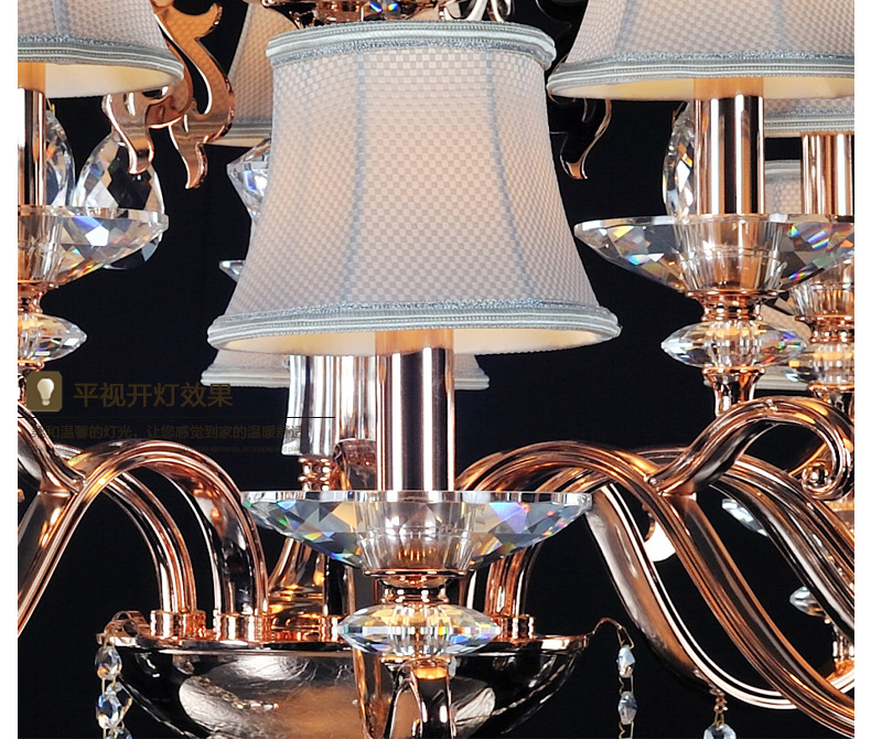 优质五金锻打弯管造型,多头装饰定制铁件,五金电镀玫瑰金色,配K9水晶灯碟及挂件,米黄束腰布罩