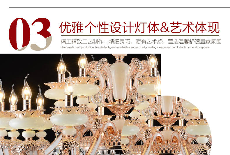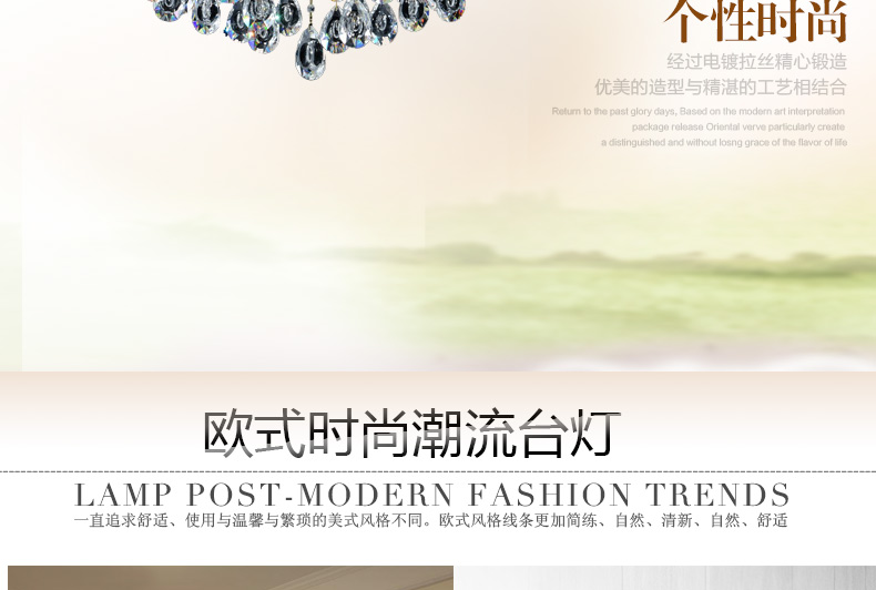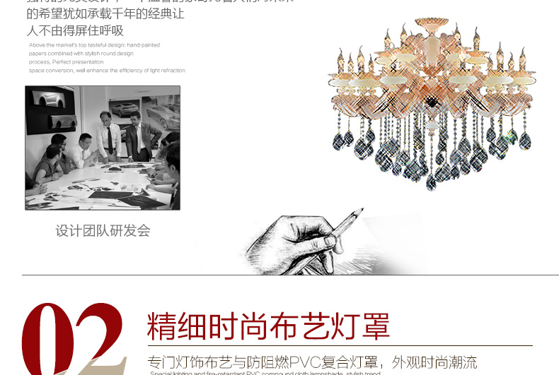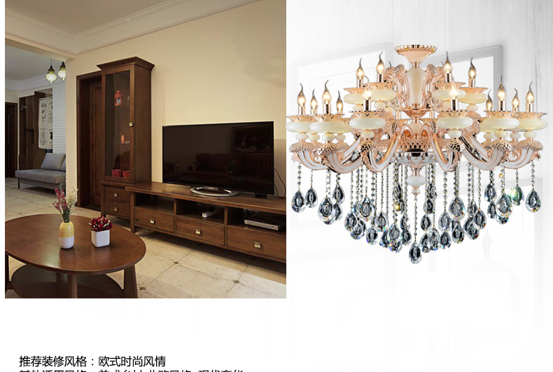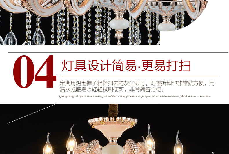 蜡烛水晶吊灯体现出欧式皇家风格,给人一种尊贵的气质;加上晶莹剔透的水晶,更显得富丽堂皇,在简化欧式风格后更适合现代家居装修格调,应用范围广泛。