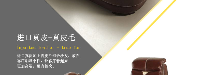用于现代进口真皮加真皮毛混搭制作的沙发因其皮质柔软、厚实、质量最好,皮质较粗厚,手感丰满、柔软、富有弹性,且具有较强的韧性和回收性,不易变形和撕裂,最重要的是透气性很好。