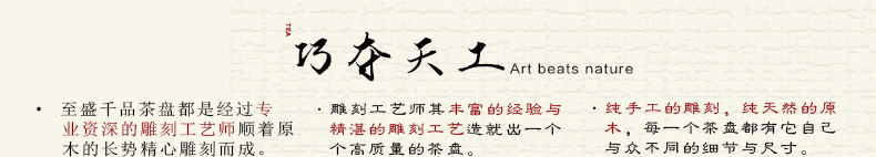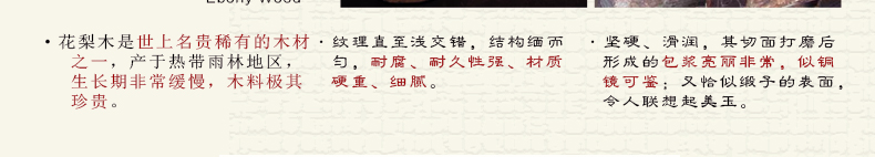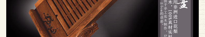 产品经科学烘干处理,注入我国古代传统色彩的雕刻工艺,设计新颖,做工精细,产品具有鲜明的个性和独特的品质,既有浓厚的民族色彩又有典雅的时代气息,全部产品采用红木工艺生产,吻合环保低碳生活的标准