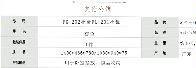 外围尺寸: FK-202妆台1400*466*780; FL-201妆镜1080*940*75