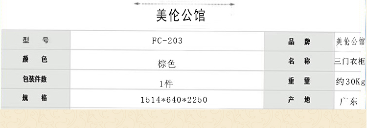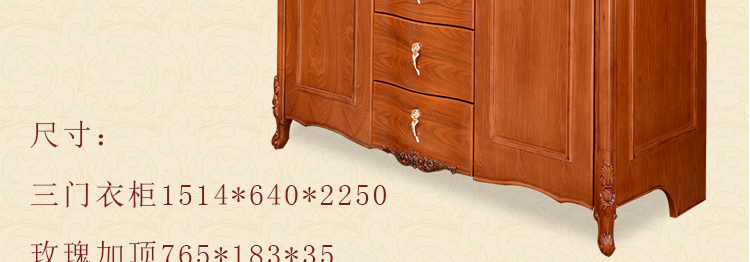 外围尺寸: FC-203三门衣柜1514*640*2250; 玫瑰加顶765*185*35
