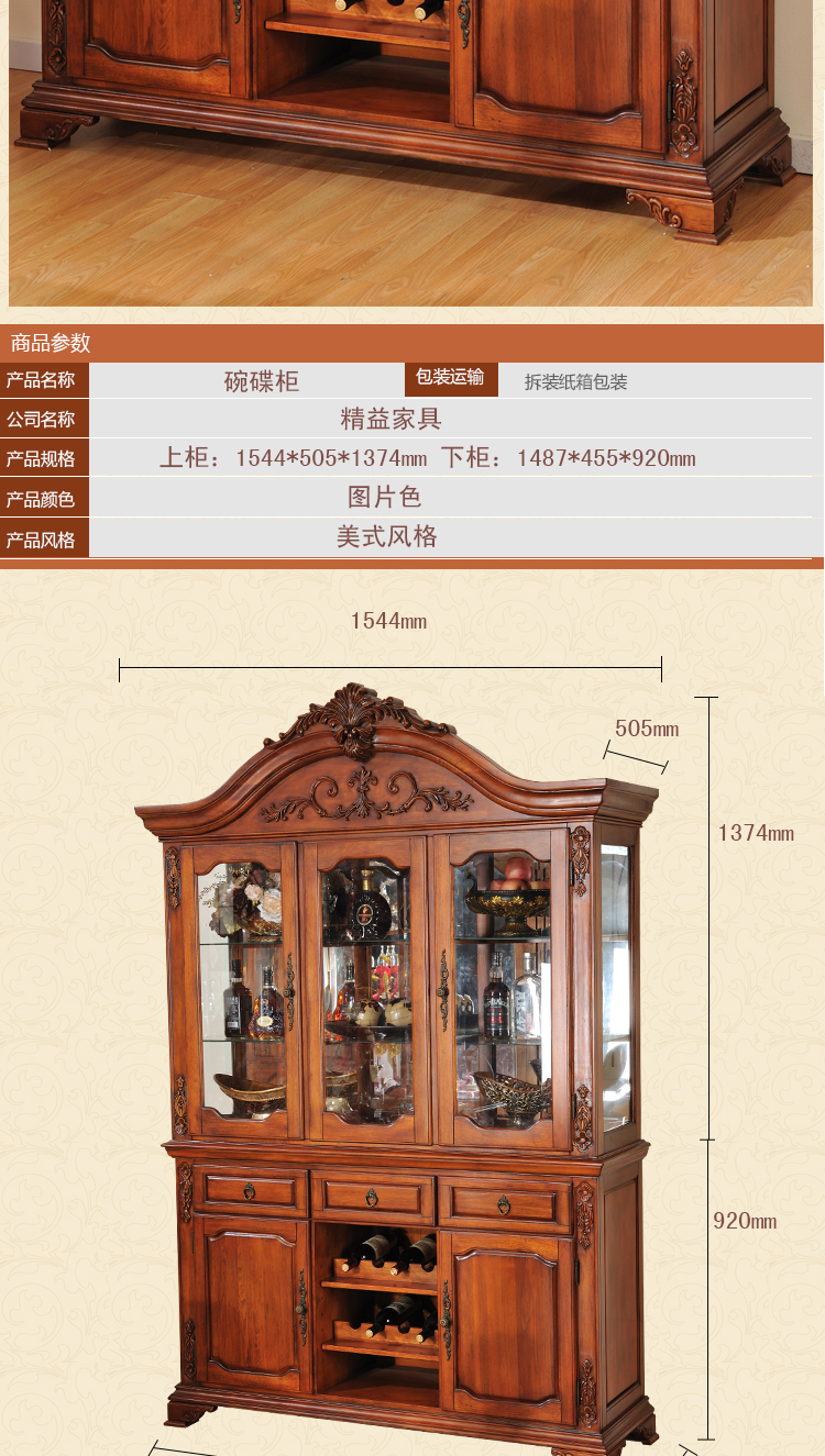 精益豪庭 餐边柜 储物柜实木餐厅收纳柜门厅碗碟柜多抽柜 美式餐边柜 酒柜 250碟碗柜