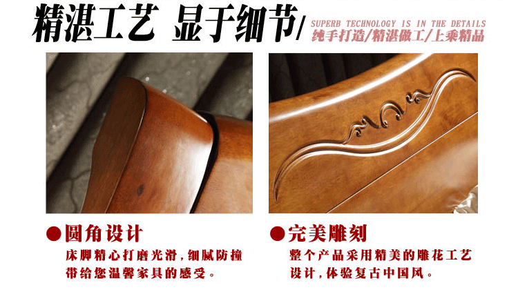 实木品质,精细手工雕花,尽显大气优雅,传承经典艺,其耐腐耐湿,质地坚韧,有弹性,抗压性、抗弯性强!