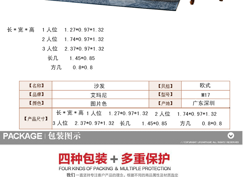 外围尺寸(长*宽*高):1人位 1.27*0.97*1.32 2人位 1.74*0.97*1.32 3人位 2.37*0.97*1.32 长几 1.45*0.85 方几 0.8*0.8m