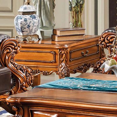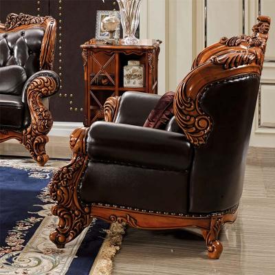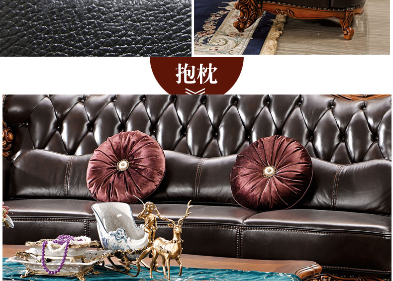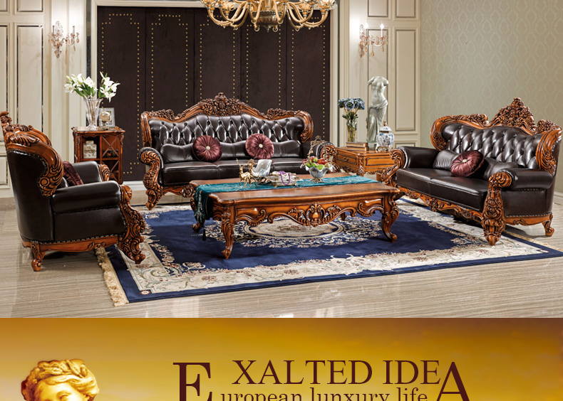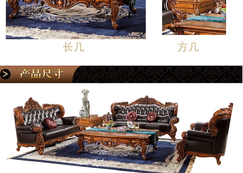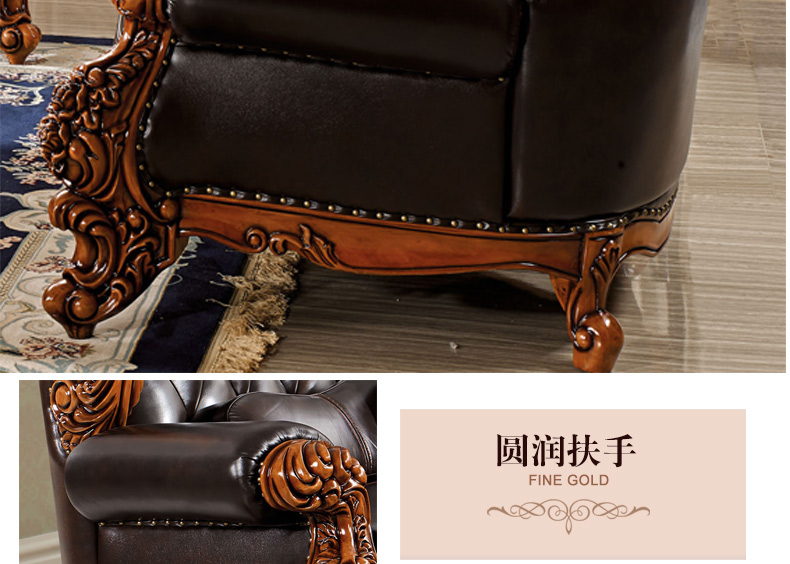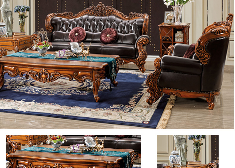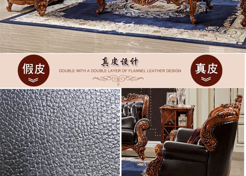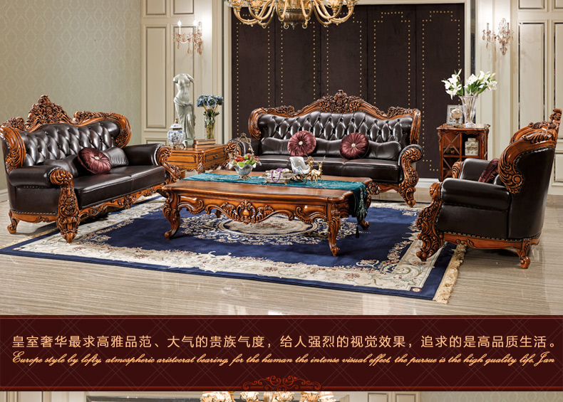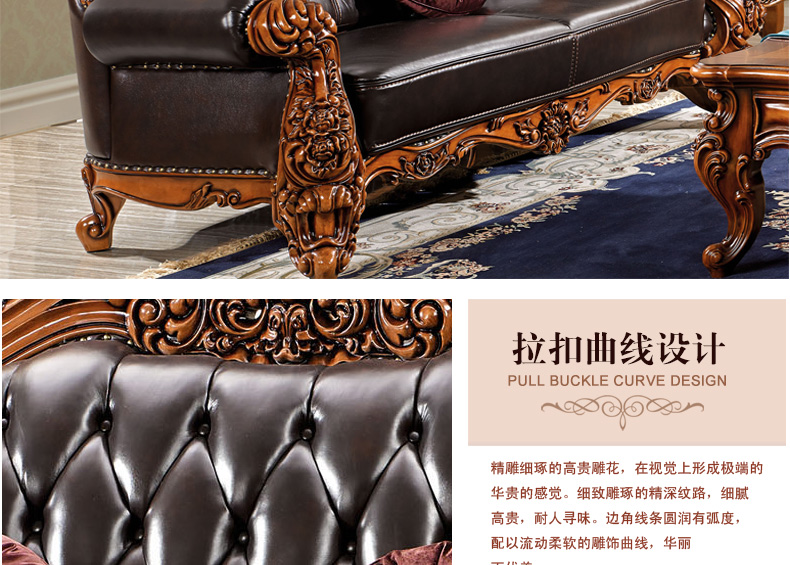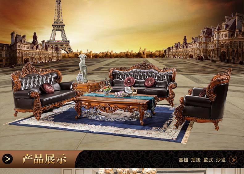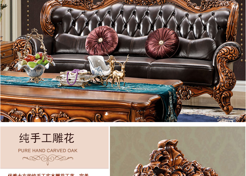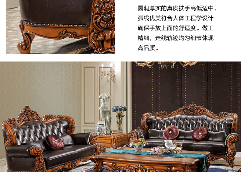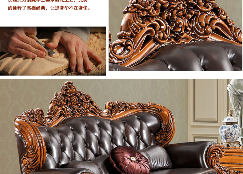 艾玛尼 欧式新款实木真皮结合沙发经典雕花沙发组合D15