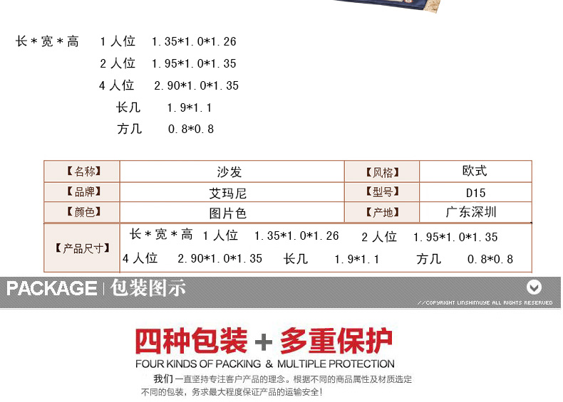 外围尺寸(长*宽*高):1人位 1.35*1.0*1.26 2人位 1.95*1.0*1.35 4人位 2.90*1.0*1.35 长几 1.9*1.1 方几 0.8*0.8m