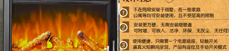 壁炉具有清洁卫生安全可靠装卸便利燃烧利用率高等特点;壁炉不仅能节省取暖成本,还可以带来高雅的观赏效果.安全便利的享受壁炉所带来的温馨和舒适.轻触开关,神奇的火焰效果瞬间展现.华美的火焰将为您居家装潢带来美丽的心情.嵌入式和独立式电壁炉给房间带来温馨和舒适.