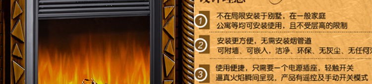 壁炉具有清洁卫生安全可靠装卸便利燃烧利用率高等特点;壁炉不仅能节省取暖成本,还可以带来高雅的观赏效果.安全便利的享受壁炉所带来的温馨和舒适.轻触开关,神奇的火焰效果瞬间展现.华美的火焰将为您居家装潢带来美丽的心情.嵌入式和独立式电壁炉给房间带来温馨和舒适.