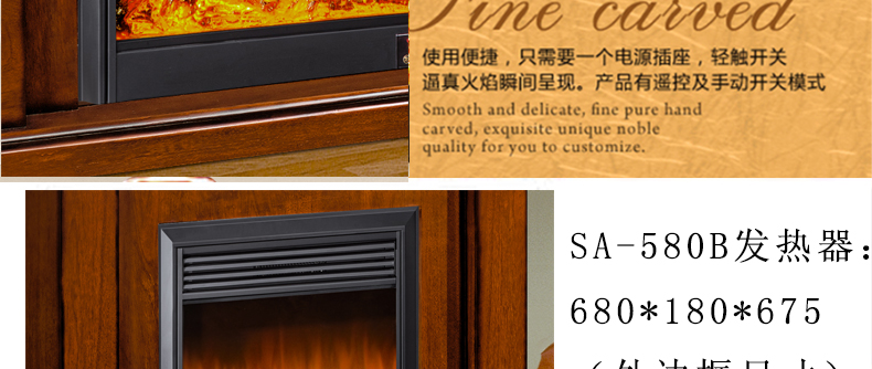 尺寸: 壁炉外框+装饰炉芯:1200*320*1100; ST-700B装饰炉芯:725*170*700; SA-580B发热器:680*180*675(外边框) 580*180*615(内边框)