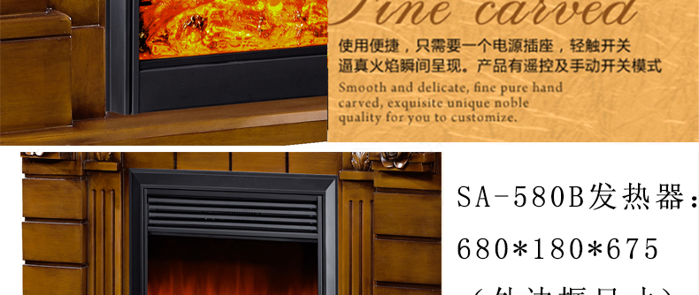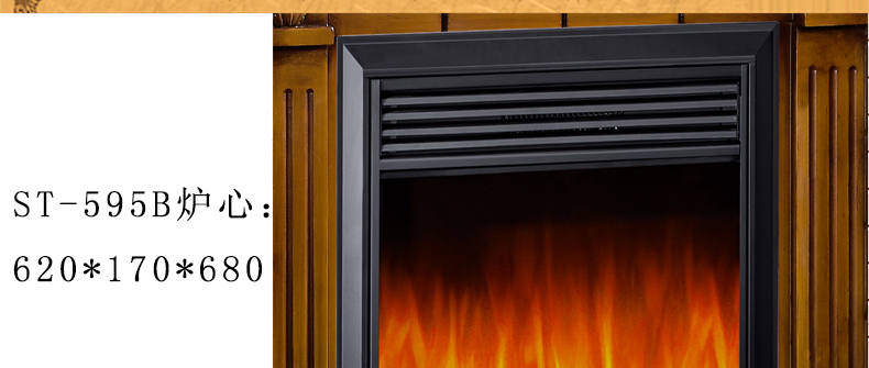 尺寸: 壁炉外框+装饰炉芯:1300*320*1090; ST-595B装饰炉芯:620*170*680; SA-580B发热器:680*180*675(外边框) 580*180*615(内边框)