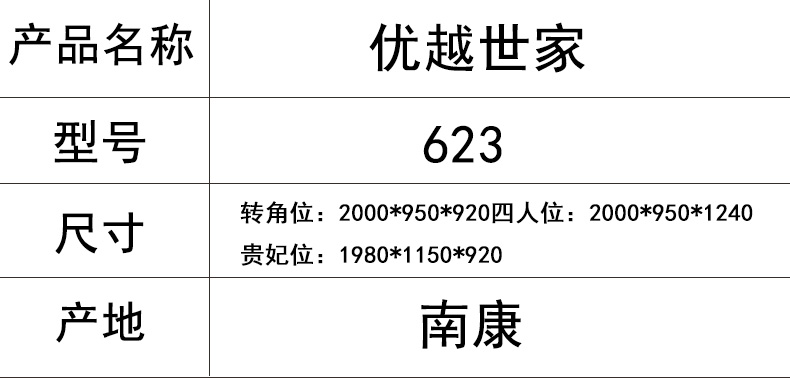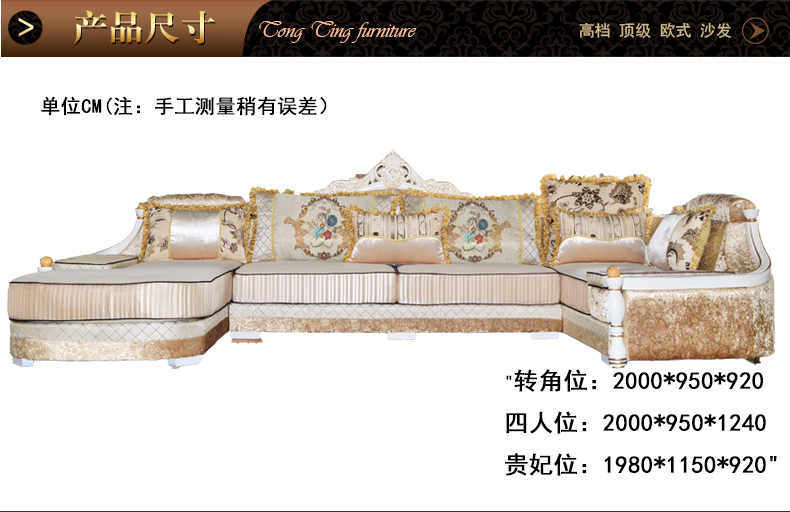 尺寸:"转角位:2000*950*920四人位:2000*950*1240 贵妃位:1980*1150*920" 产品包含: 沙发3件、抱枕7个