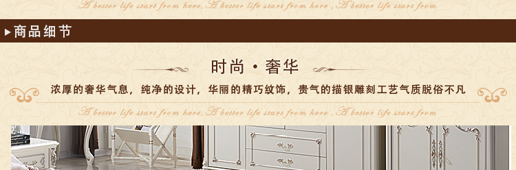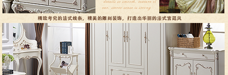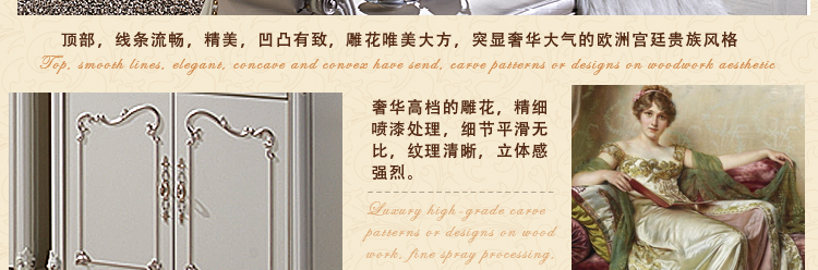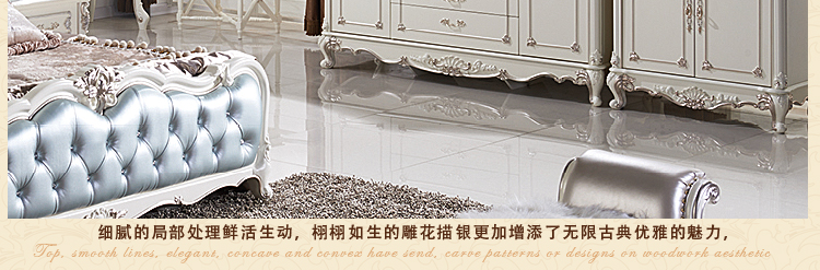 【設計】傳承歐式家具藝術,高貴大氣浪漫韻味十足為您打造富麗堂皇溫馨幸福生活。 【真材實料】100%全實木框架制作,純手工雕刻,立體感更強,雕花生動自然。工藝價值更高。采用綠色環保漆,健康實用 【性價比高】廠家直銷,廠家→客戶,省去實體店中間所有收費環節