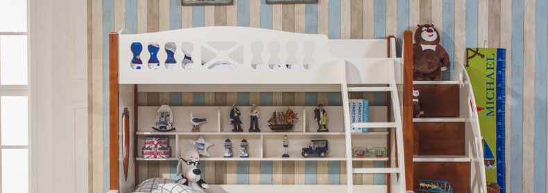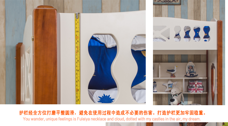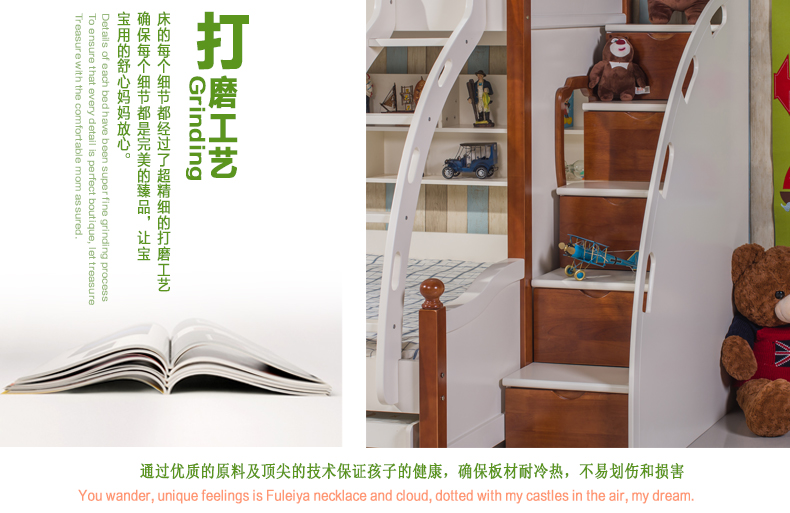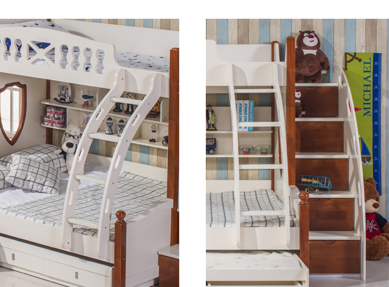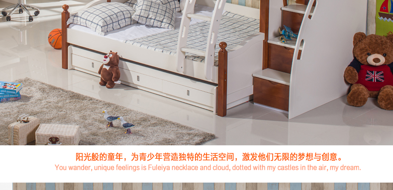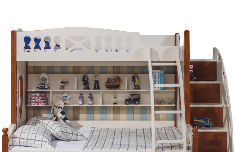 孩子在成长中家庭居住环境很大程度影响着孩子的性格养成。双明宝贝运用色彩搭配学设计家具,为孩子搭建一个色彩童年养成阳光积极向上的性格。实木高低床,粗实的框架,稳定的构造。采用纯实木打造,环保水性油漆