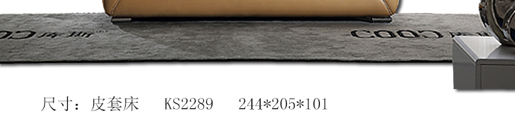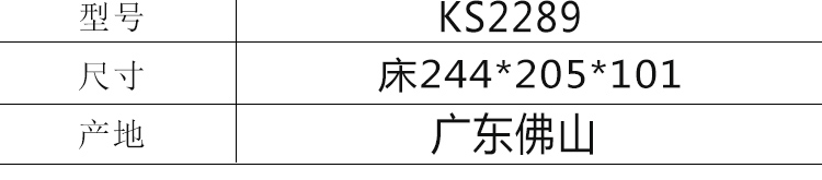 外围尺寸:皮套床KS2289:244*205*101;床头柜F-165:53*40*43;床品C2289普笠6件套。