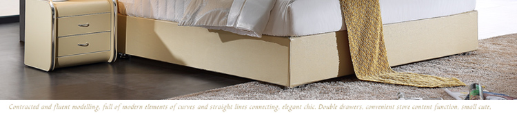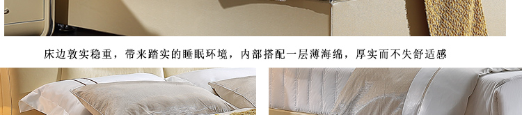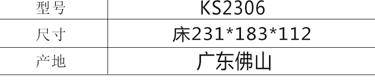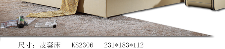外围尺寸:皮套床KS2306:231*183*112;床头柜F-8:49*43*49;床品C2306棉笠六件套。