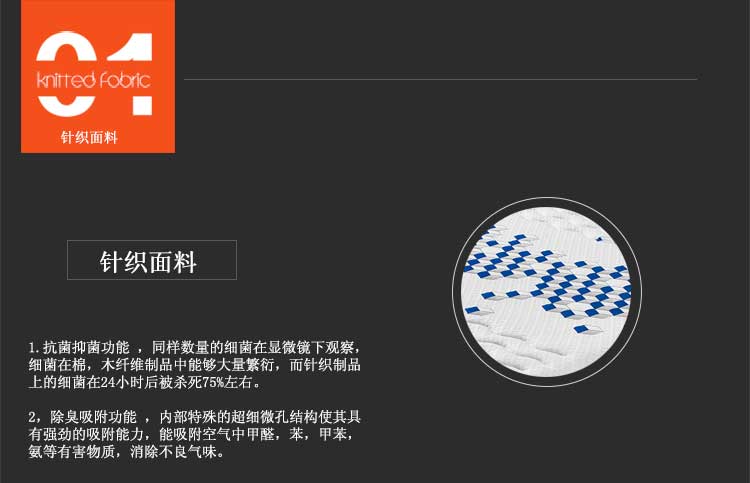 1 高碳钢丝独立袋装弹簧分区分段.2 独立单针花型床垫.3 进口太空记忆棉.4 四周边缘加固加密系统
