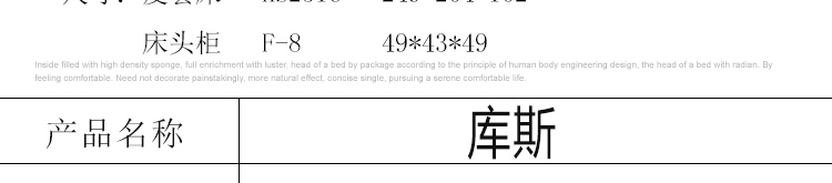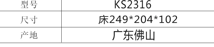 外围尺寸:皮套床KS2316:249*204*102;床头柜F-8:49*43*49;床品C2316普笠四件套。