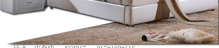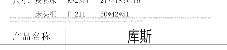 外围尺寸:皮套床KS2317:217*183*116;床头柜F-211:50*42*51;床品C2317棉笠六件套。