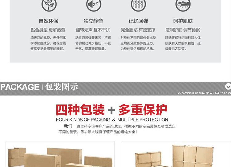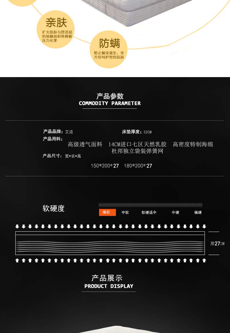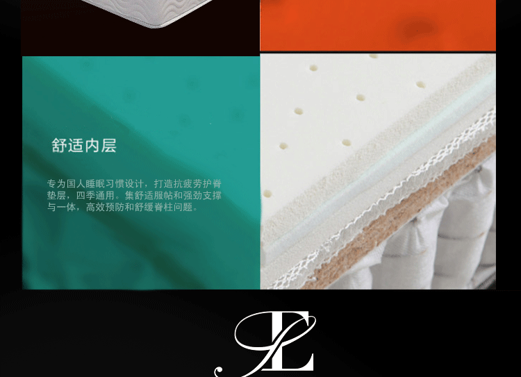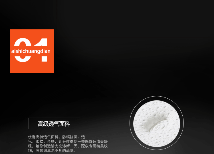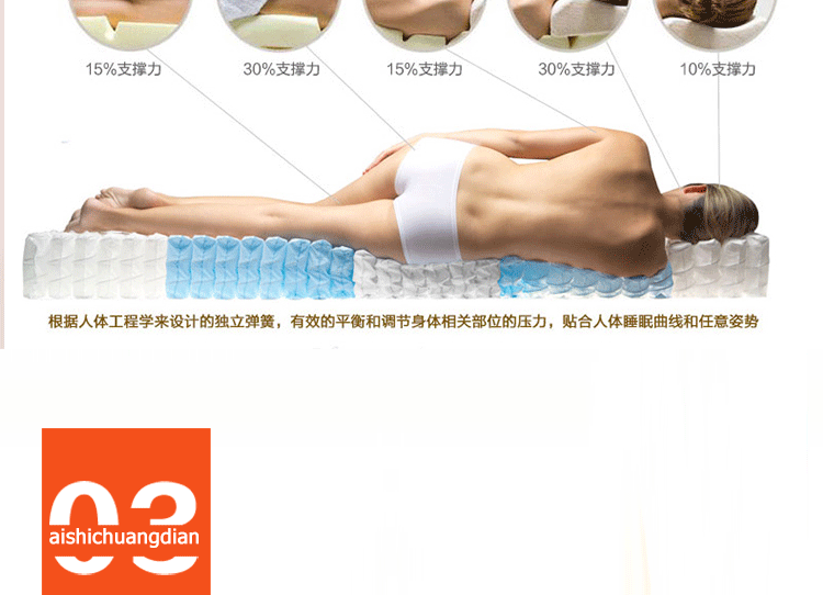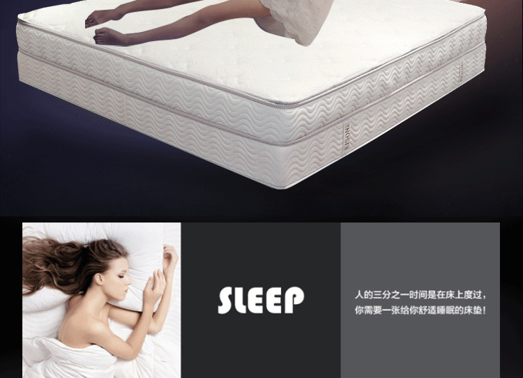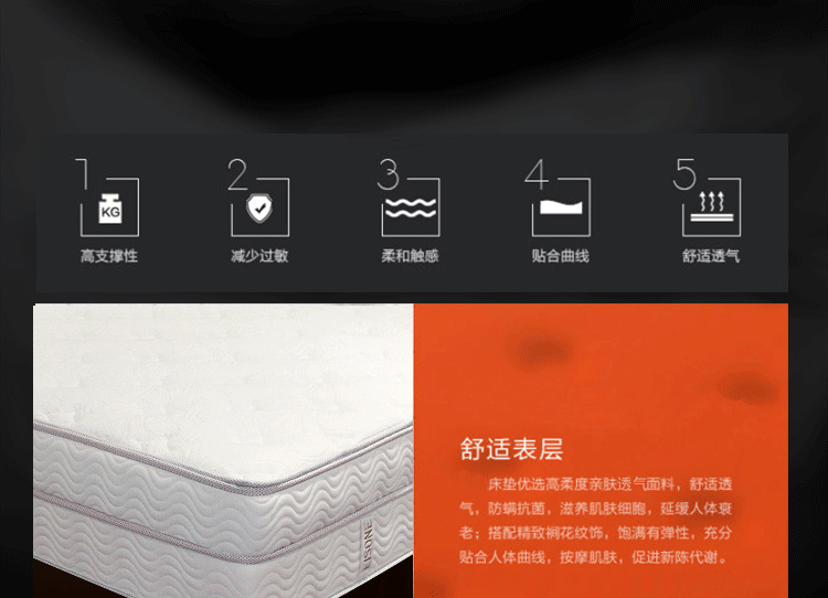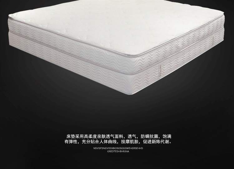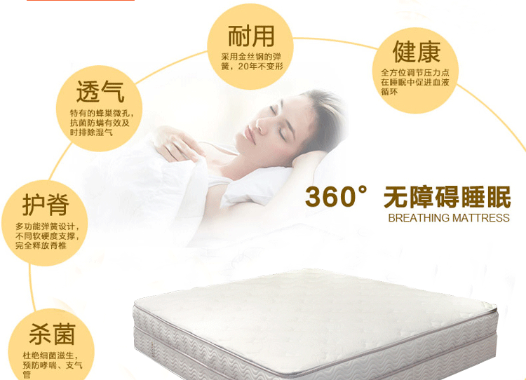 高级透气面料,抗菌防螨,排除潮气,全方位调节压力,在睡眠中促进血液循环,多功能弹簧可以完全释放脊椎,扩大肌肤与舒适层的接触面积,将睡眠压力化零。