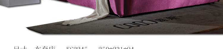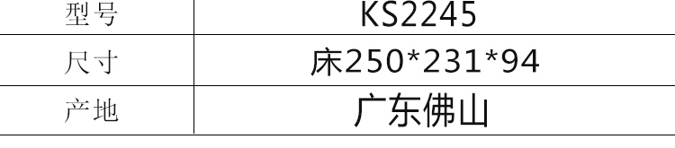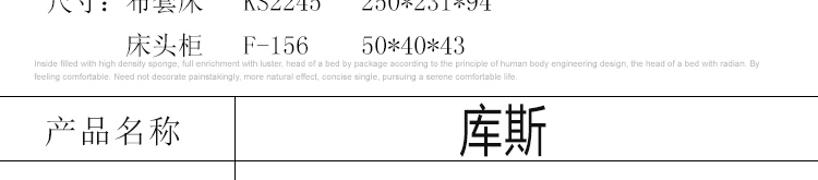 外围尺寸:布套床KS2245:250*231*94cm;床头柜F-156:50*40*43cm;床品C2245棉笠五件套。