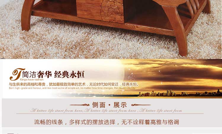 外观漂亮,耐用性强,环保,无气无味无辐射,实木,稳定性强客厅家具的首选,具有时尚简约为一体的风格。