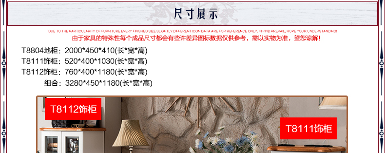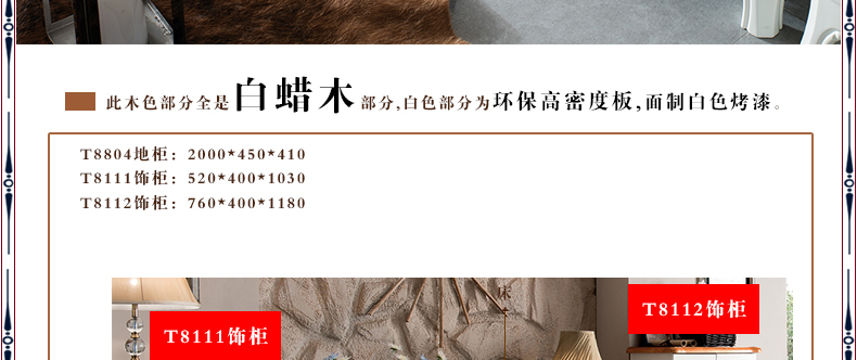 外围尺寸: 地柜:2000*450*410; T8111饰柜:520*400*1030; T8112饰柜:760*400*1180; 茶几:1380*700*450