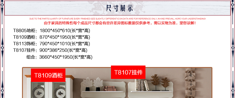 外围尺寸: T8112饰柜:760*400*1180; T8805地柜:1800*450*610; T8109酒柜:870*450*1950; T8113饰柜:790*450*1010; T8107挂件:900*386*250