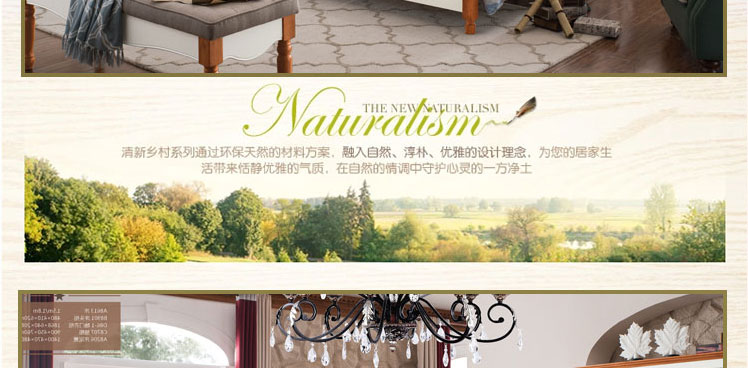 田园风格的设计它摒弃了经典的艺术传统,追求古代田园一派自然清新的气象,在情趣上不是表现强光重彩的华美,而是纯净自然的朴素,以明快清新具有乡土风味为主要特征,以自然随意的款式、朴素的色彩表现一种轻松恬淡的、超凡脱俗的情趣。