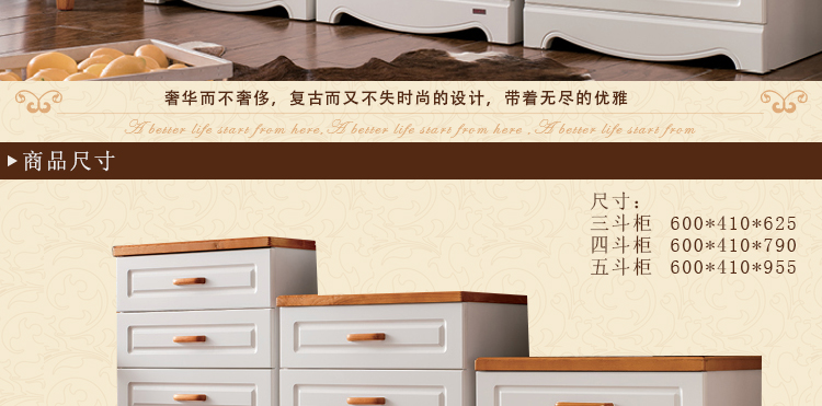 外围尺寸:三斗柜: 600*410*625; 四斗柜: 600*410*790; 五斗柜: 600*410*955;