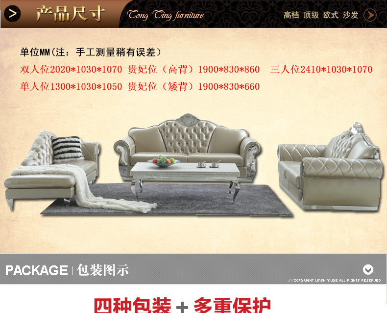 尺寸: 单人位:1300*1030*1050; 贵妃位(高背):1900*830*660; 贵妃位(矮背):1900*830*860; 双人位:2020*1030*1070; 三人位:2410*1030*1070