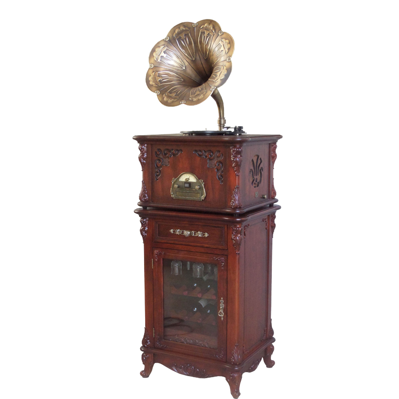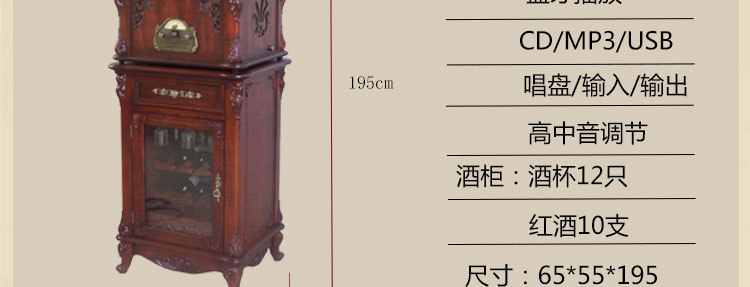 功能:收音FM CD/MP3/USB 唱盘/输入/输出 高中低音调节蓝牙播放 酒柜:酒杯12只 红酒10支