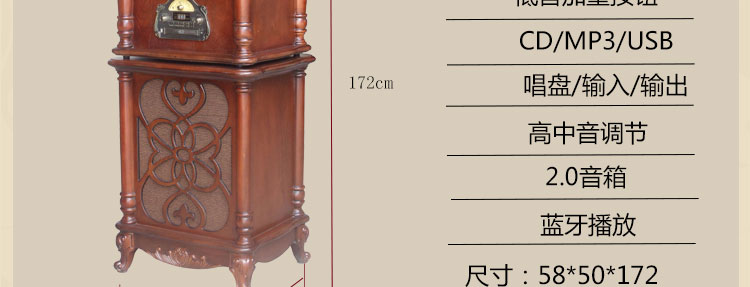 功能:收音AM/FM CD/MP3/USB 唱盘/输入 2.0音箱 低音加重按钮 高中音加重按钮 蓝牙播放