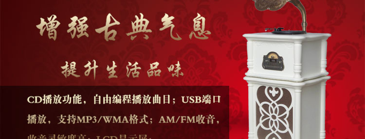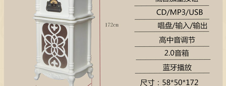 功能:收音AM/FM CD/MP3/USB 唱盘/输入 2.0音箱 低音加重按钮 高中音加重按钮 带蓝牙播放