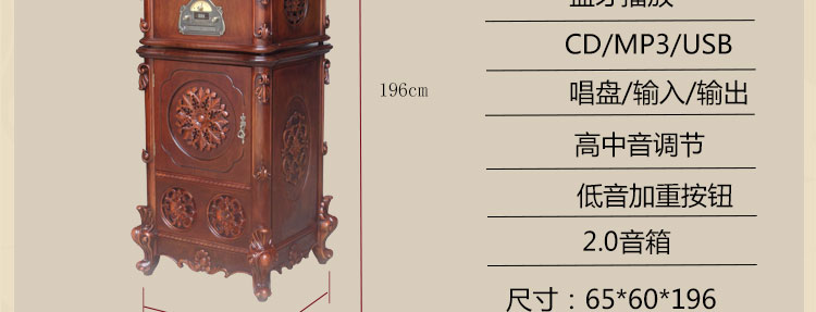 功能:收音AM/FM CD/MP3/USB 唱盘/输入/输出 2.0音箱 低音加重按钮 高中音加重按钮 蓝牙播放
