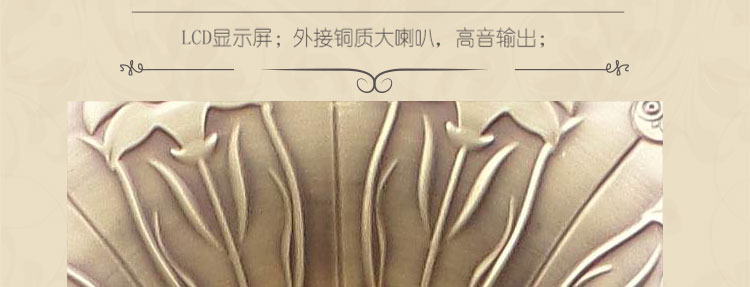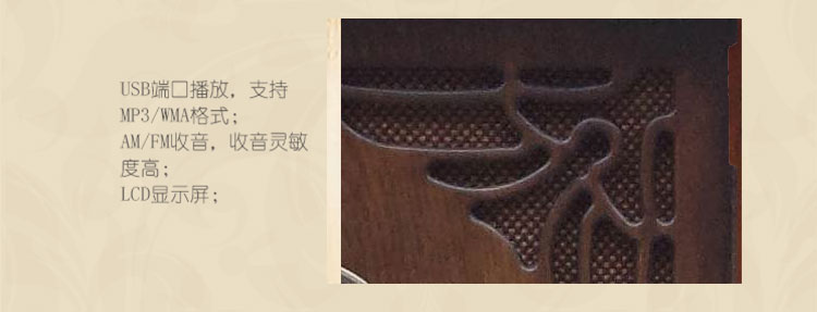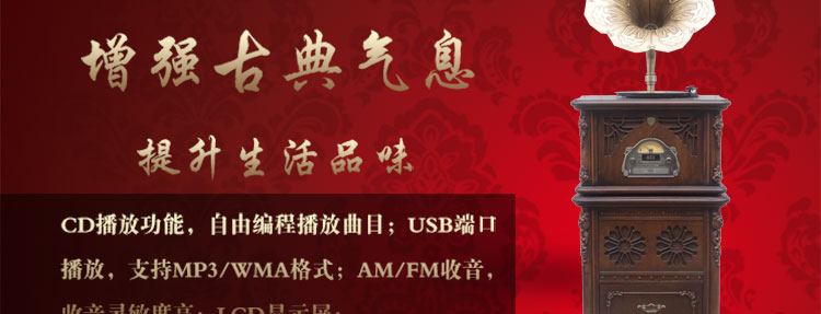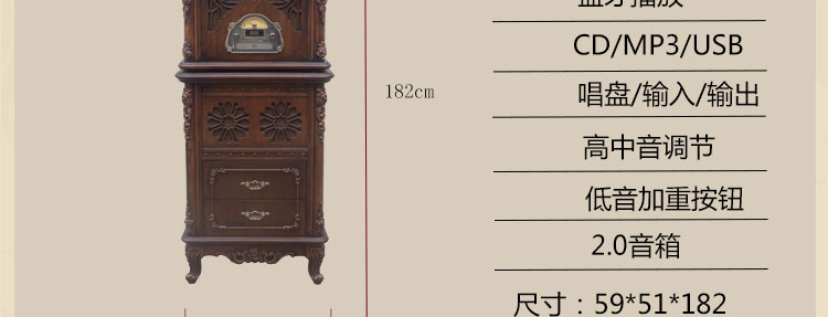 功能:收音AM/FM CD/MP3/USB 唱盘/输入/输出 2.0音箱 低音加重按钮 高中音加重按钮 蓝牙播放