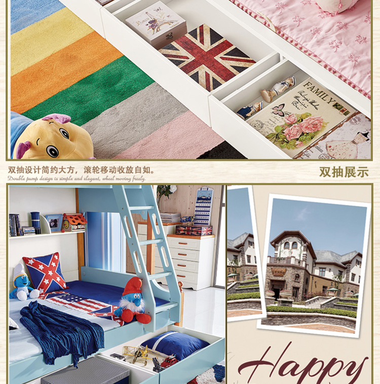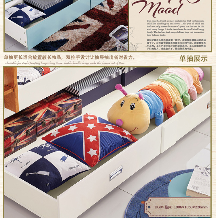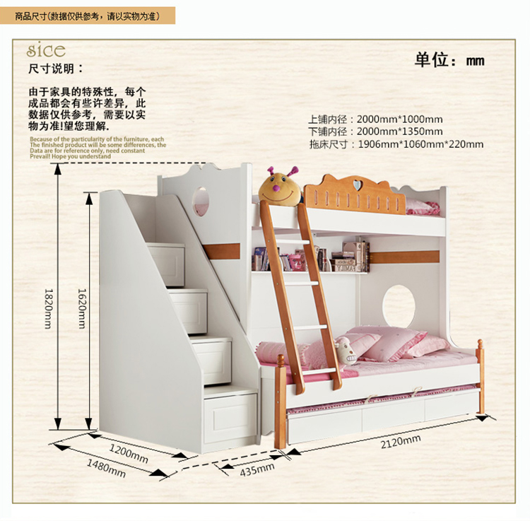 尺寸: 双层床:2120*1480*1820; 拖床:1906*1060*220; 楼梯柜:1200*435*1620