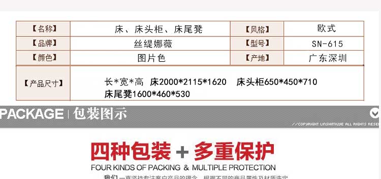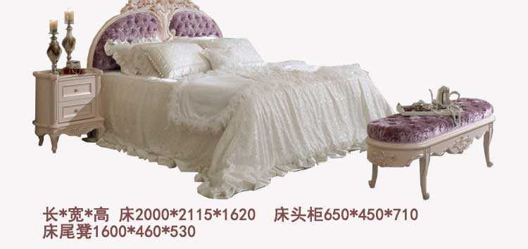 外围尺寸(长*宽*高):床2000*2115*1620 床头柜650*450*710 床尾凳1600*460*530mm